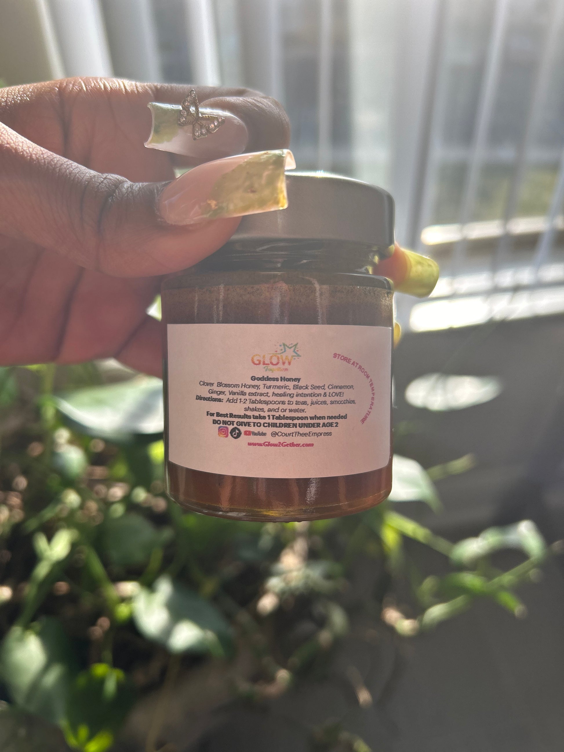 Goddess Honey A divine blend of clover honey, turmeric, black seed, cinnamon, ginger, and vanilla extract, infused with healing intention and LOVE. Perfect for tea, drizzling, or enjoying by the spoonful.